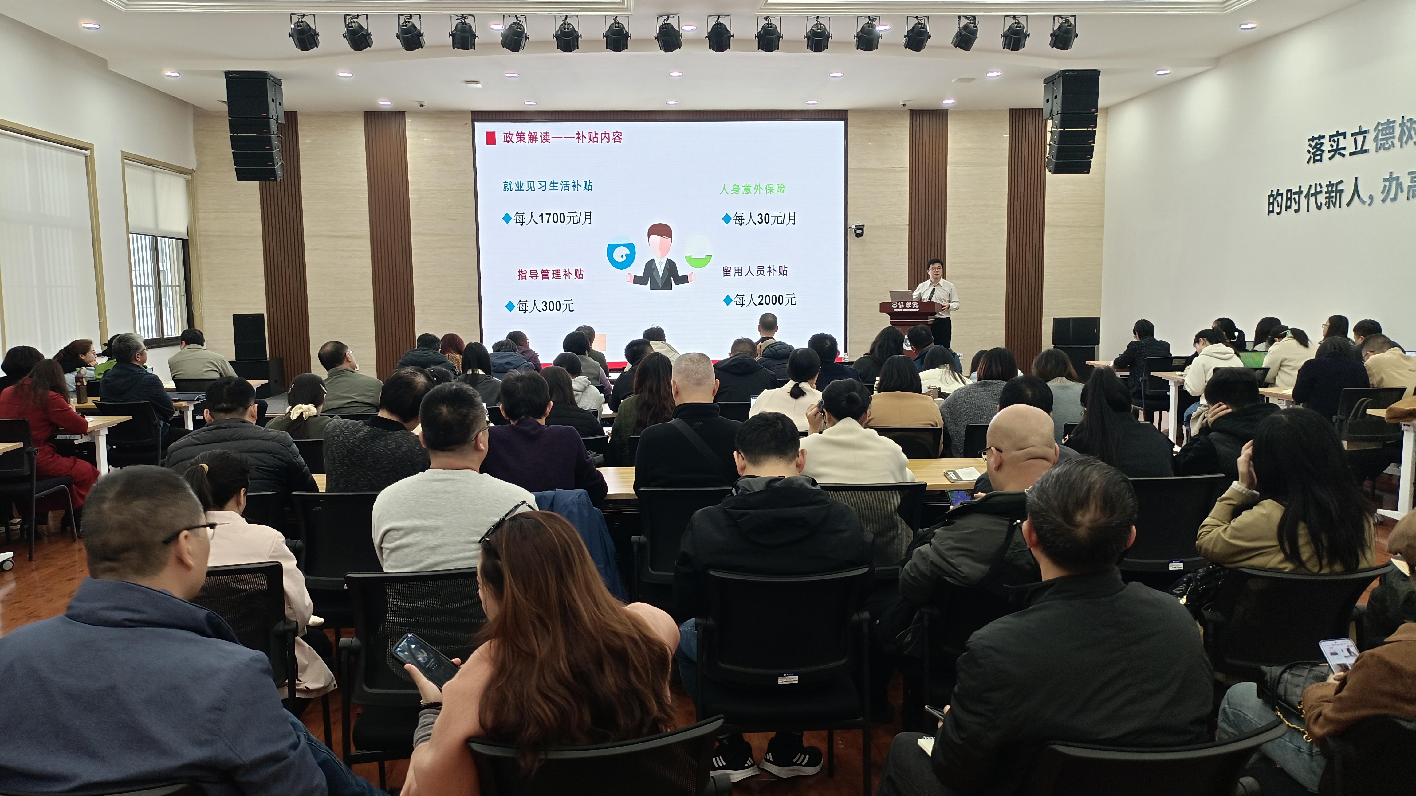 主讲人围绕就业见习补贴政策,深入讲解了申请条件、补贴标准、面向人群、补贴内容、认定条件、认定流程、认定成功企业挂牌等内容,对补贴政策的解读详细透彻。互动环节,各学院争相提问,现场讨论异常热烈,老师们就实习基地审批时长、基地申请的标准、企事业单位具体哪个部门负责申请、什么单位负责审核、大学生实习补贴发放的时间是从什么时间算起等一系列问题现场提问,主讲人针对老师们的疑惑都一一进行了解答。