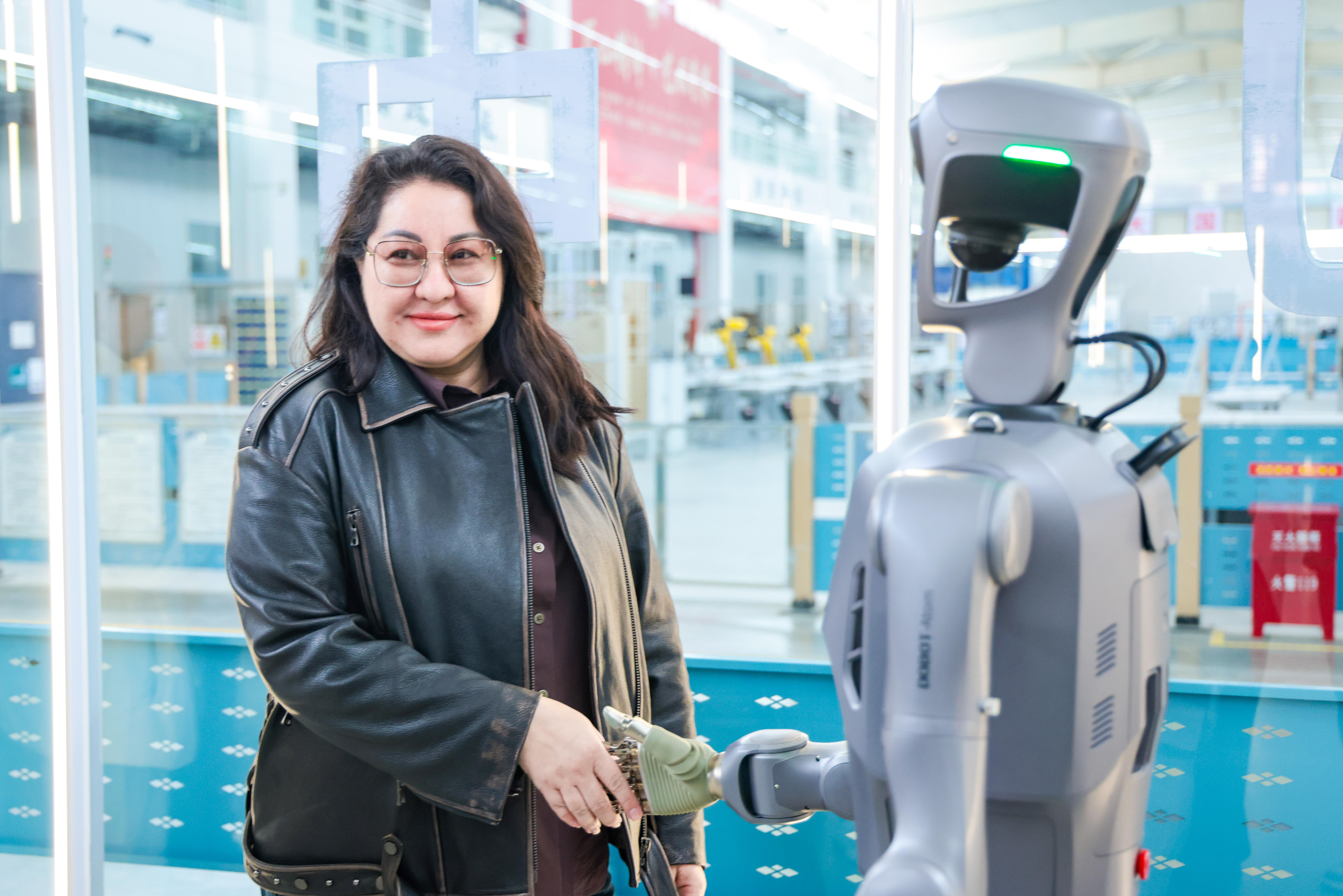 哈萨克斯坦欧亚创新大学副校长与机器人互动