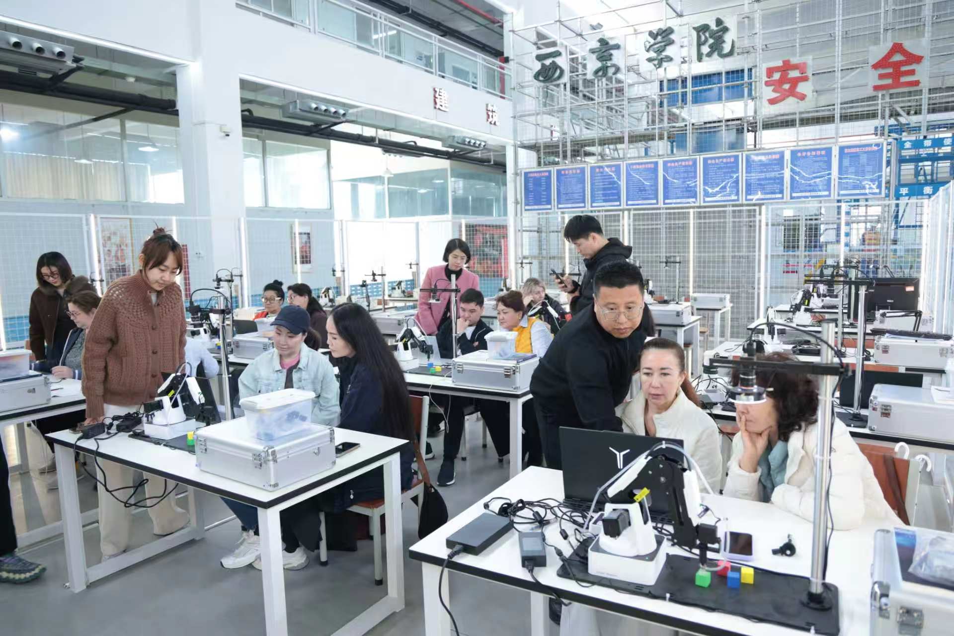 教学现场,实验室薛亚楠老师首先向研学团学者详细介绍了实验室的建设理念、功能布局与发展成果。他们认真聆听讲解,不时驻足询问。在实践体验环节,指导教师与学生志愿者共同引导研学团学者近距离接触各类智能机器人、人工智能实验设备,手把手演示机器人编程、智能体搭建等基础操作。研学团学者们踊跃参与,亲手操作实验设备,感受人工智能技术的独特魅力,在实践中加深对人工智能的理解。