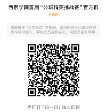 请已报名的同学 加入钉钉群:西京学院首届“公职精英挑战赛”官方群,钉钉群号: 123050023888。后续所有赛事相关事宜,均在群内通知。